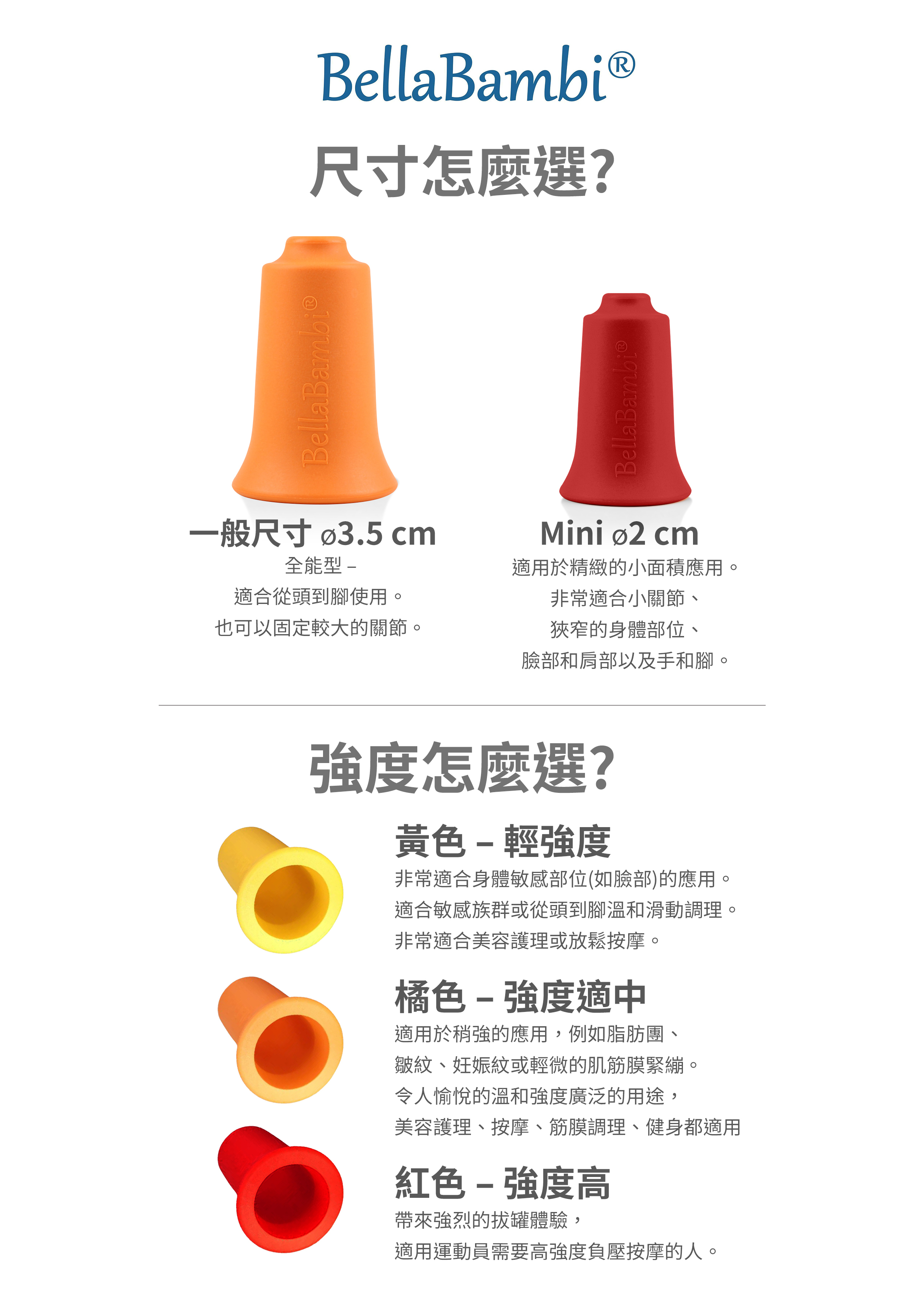BellaBambi®是溫和的筋膜滑罐,具有創新的杯緣設計。耐用的矽膠吸盤以三種強度展現其負壓:低強度、中強度和高強度。BellaBambi®是材質安全,無毒防臭,皮膚無害,符合最高質量標準 - 100%德國製造。