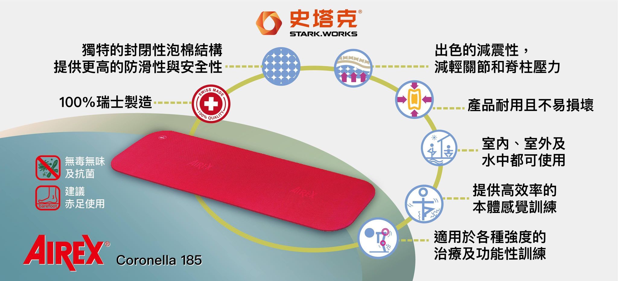 專為 AIREX® Coronella 開發的材料尺寸非常穩定,可承受更大的物理載荷。 同時,運動墊仍可隨意捲起,隨時收起。AIREX® Coronella 是一流健身房和運動俱樂部的標准設備的一部分,供私人教練使用。它是與運動員和治療師合作開發的,完全滿足他們的要求。