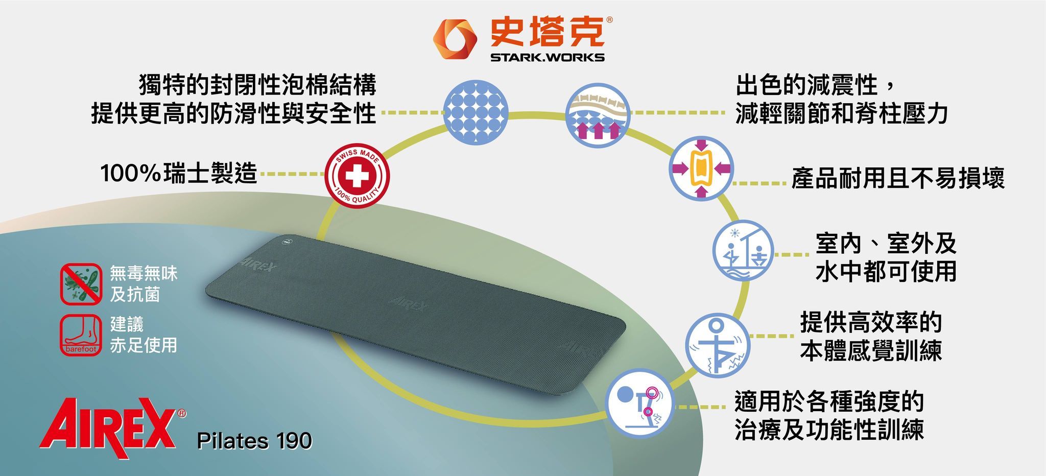 得益於獨特的AIREX® 生產工藝,Pilates190 具有與AIREX® 體操墊與眾不同的緩衝效果,並有助於有效地保護關節和肌腱。是一款非常經典的墊子,也是訓練時的必備品。